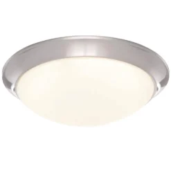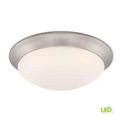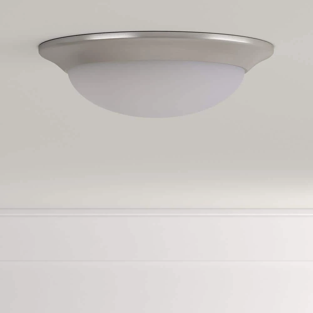 The Commercial Electric Brushed Nickel Finish 11 in. LED Flushmount with frosted white glass is designed to look great in any room while save you money at the same time. This dimmable, 12 in. round ceiling mounted light features a brushed nickel finish and sleek white glass diffuser. The integrated LED light source reduces energy consumption by 70 percent. Because there are no bulbs to replace, it saves you time and money.