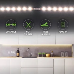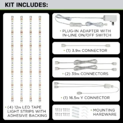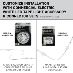 This Commercial Electric tape light kit includes 4 in. x 12 in. linkable indoor warm white LED tape lights, power supply, mounting hardware and connector wires. LED’s are extremely energy efficient, with the full 48 in. using a mere 8.5-Watt. Use the strips to add accent lighting to any space. Great for kitchens, work spaces, showrooms and more. Customize application with available connector or accessory sets.