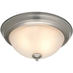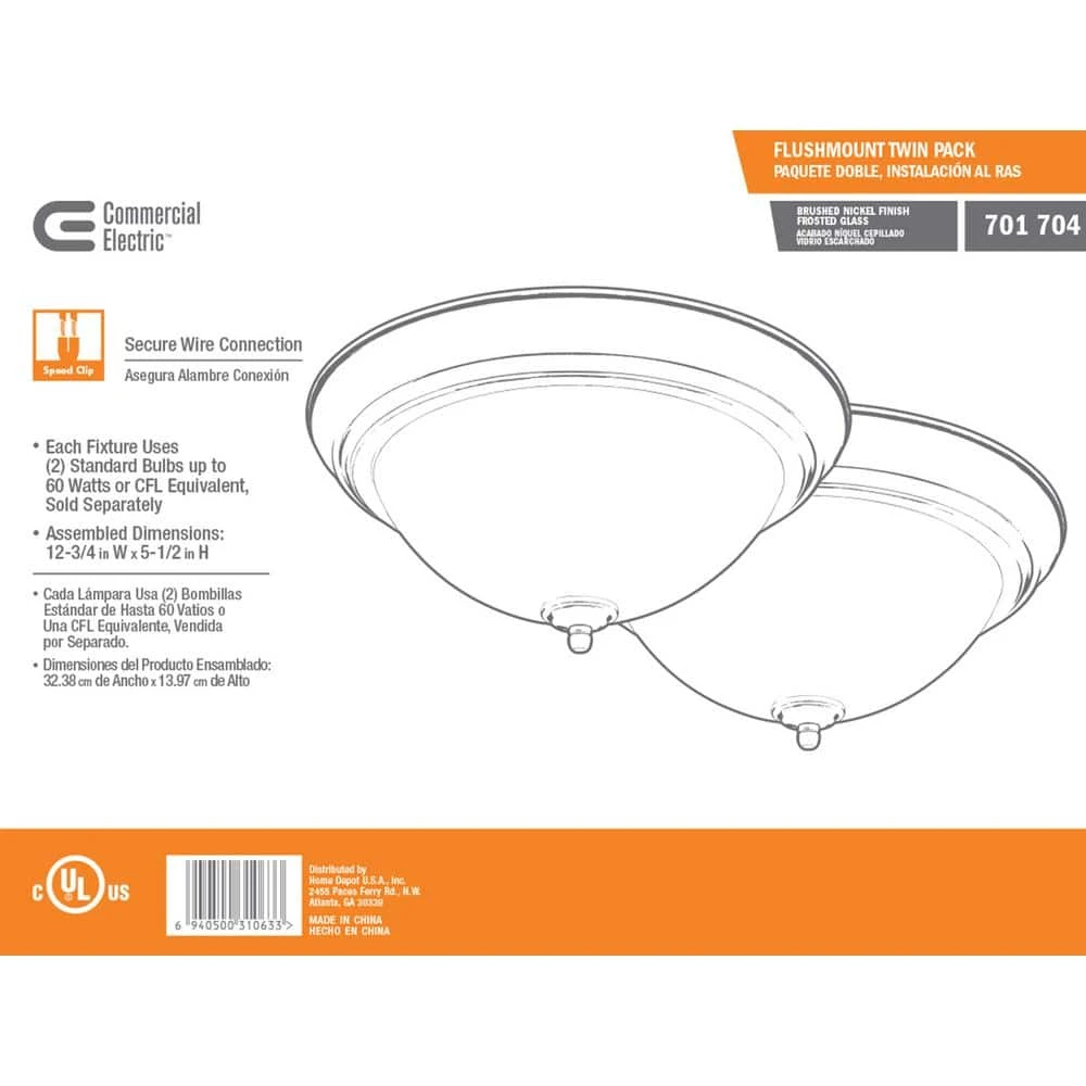 The Commercial Electric twin pack Flush Mount is a great look at a great value. From the professional to the do-it-yourselfer, the twin pack flushmount is an exceptional choice. Each Flush Mount is finished in Brushed Nickel with frosted white glass. Each Flush Mount uses two 60-Watt medium-base light bulbs. From kitchen to bath or any room in between, the CE Brushed Nickel twin pack will not only enhance but will save cost to your home as well.