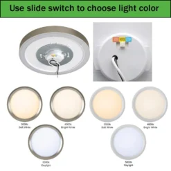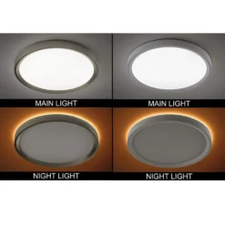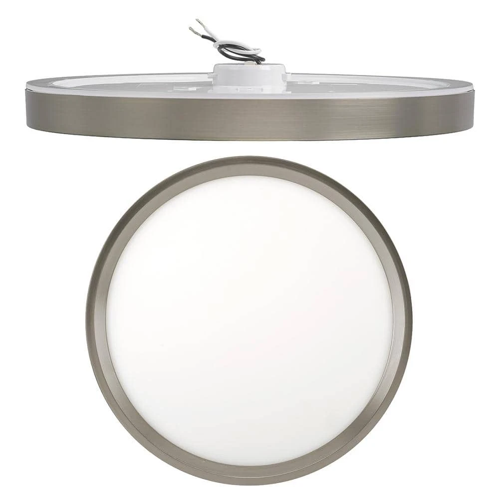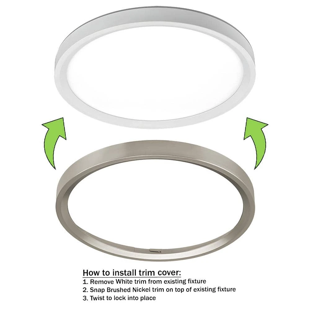 Commercial Electric Low Profile 13in. LED Flush Mount with 2 interchangeable trims is the perfect way to update your lighting by replacing outdated incandescent bulbs with energy-efficient LED technology. Prior to installation, switch out the White trim for the Brushed Nickel trim to add a little pop of color into your space. Additionally, choose between 3 color temperatures of light output: Soft White, Bright White or Daylight using the slide switch on the back of the fixture. Activate the Night Light feature which emits a Soft Amber glow around the fixture providing warm ambient lighting. Our innovative mounting system allows for quick installation into existing junction boxes using the TwistFit mounting bracket. (included) This flush mount is maintenance free with no bulbs required and lasts up to 50,000 hours. Great for kitchen, pantry, bedrooms, bathrooms, closets, stairways, hallways, basement, laundry room, craft room, playroom, den/office, retail store or boutique.