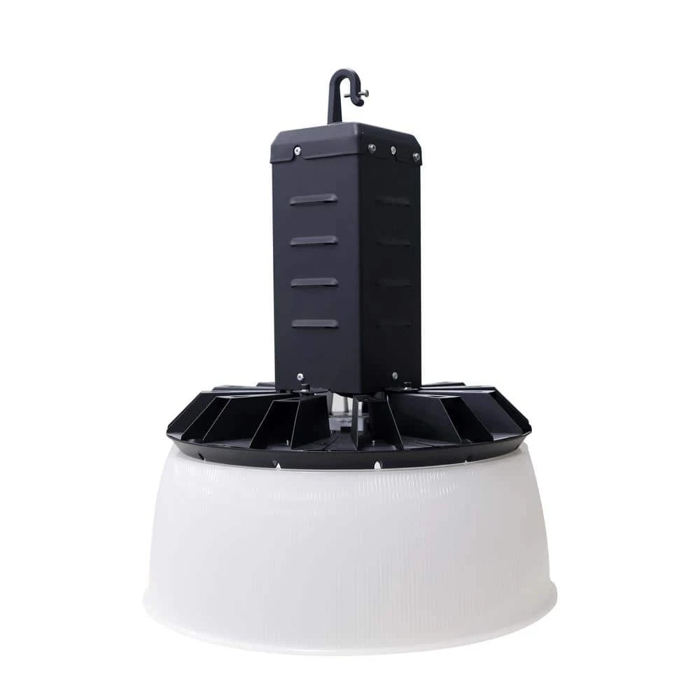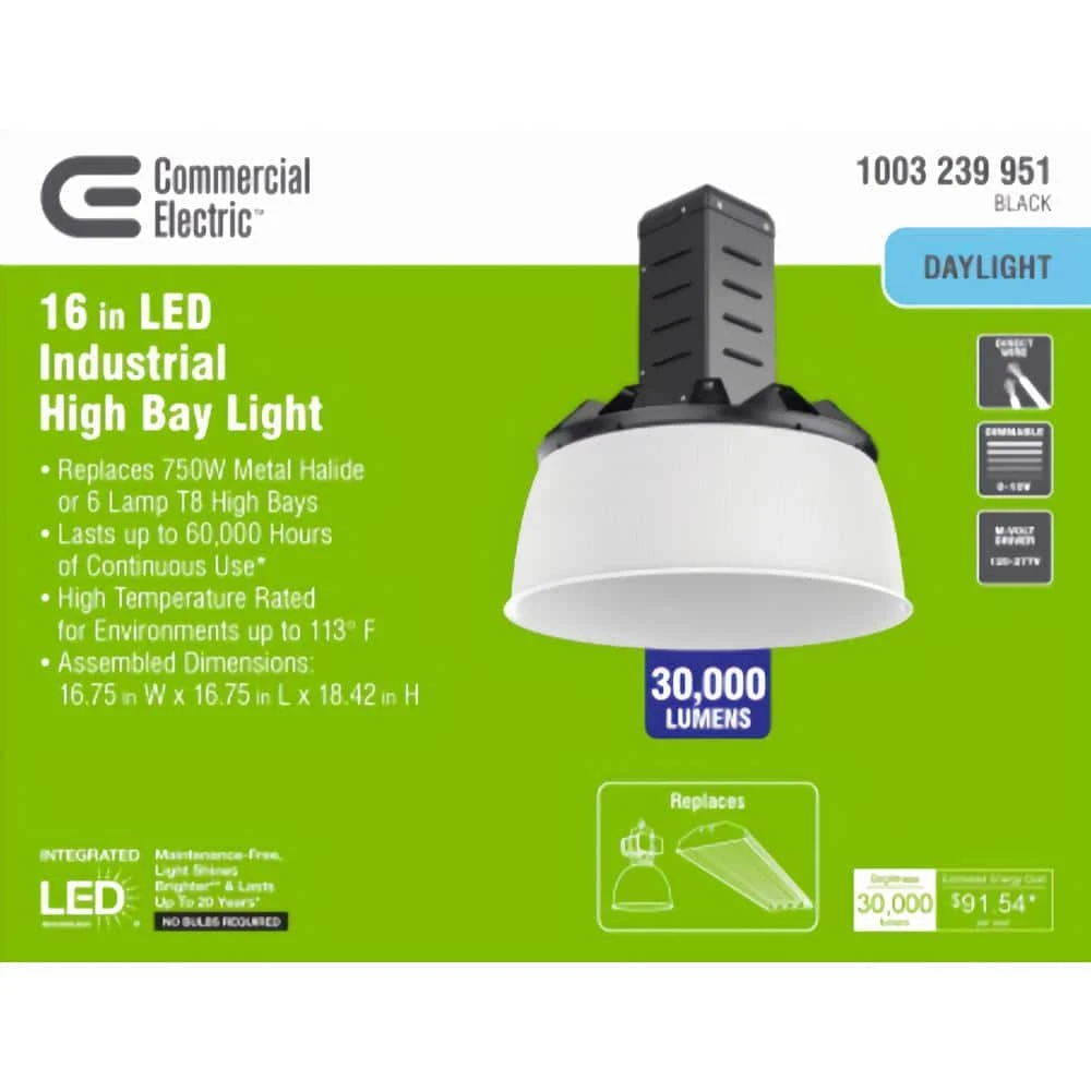 The Commercial Electric High Lumen Round LED High Bay offers superior uniform LED lighting for a variety of applications such as warehouses, manufacturing spaces, commercial spaces and gymnasiums. The compact design with single point mounting allows for easy installation and replacement of traditional HID lighting. With a reduction in energy consumption to 285-Watt LED – comparable to 750-Watt traditional fixture- these LED high bay lights deliver considerable energy savings. Durable aluminum housing and LEDs rated for dust and water proof protection can withstand different environments. The performance and reliability of the CE High Lumen Round High Bay provides the solution for your industrial lighting needs. 5-year warranty.
