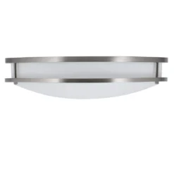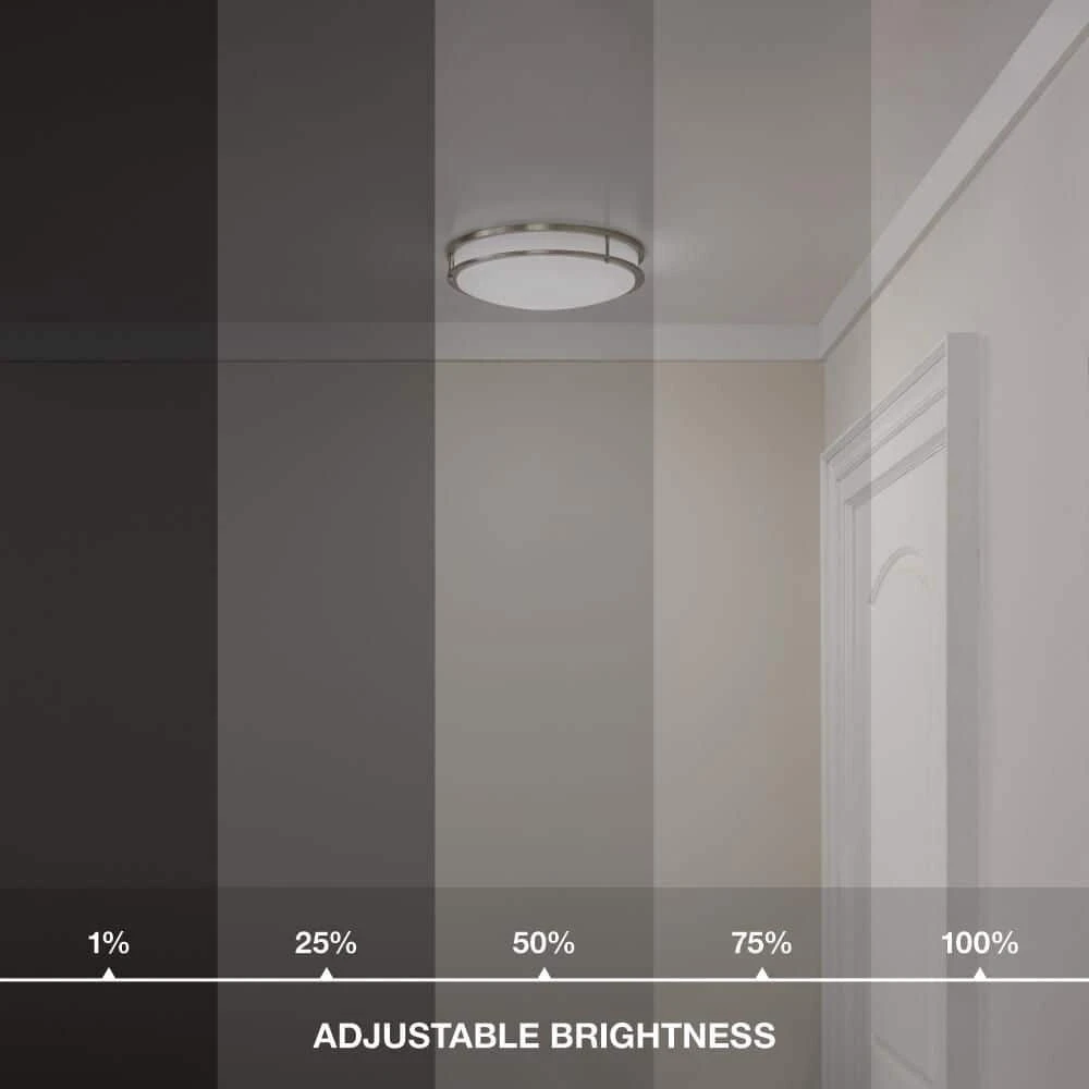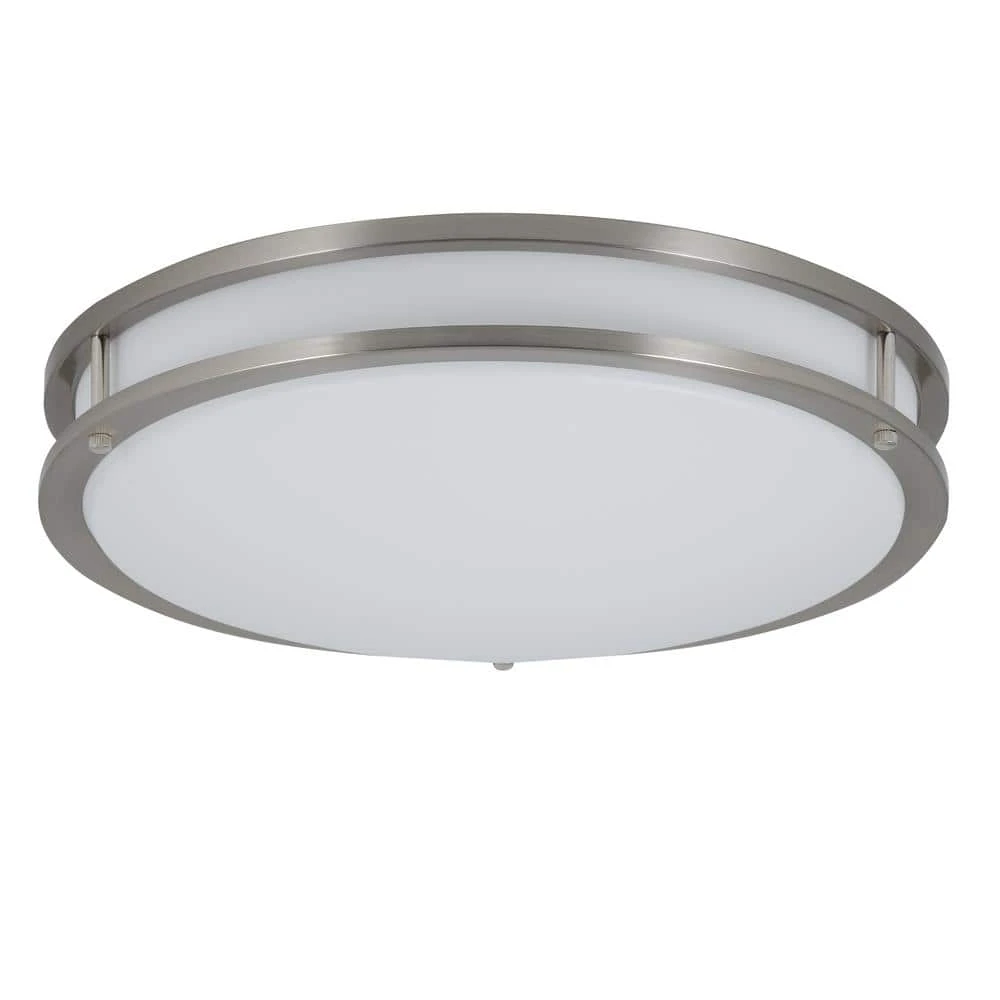 The 16 in. Hubspace Smart Integrated LED Flush Mount from Commercial Electric features a brushed nickel finish and white acrylic shade to blend in with nearly any decor. This Smart LED light can be controlled through the Hubspace app (no hub required) on your smart devices or through Alexa and Google Assistant with voice controls. Choose from millions of color options as well as tunable white color options between 2700K-6500K. The flush mount has a full brightness of 1800 Lumens and is also dimmable to your desired brightness level. Through the Hubspace app you can setup group control for multiple Hubspace compatible lights, as well as set schedules for pre-selected times for the lights to turn on and off. The integrated LED has an expected life of 50,000 -ours and is supported by a 5-year warranty. It is also ENERGY STAR rated and eligible for Title 24 rebates (where available). All hardware is included for easy installation.