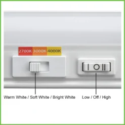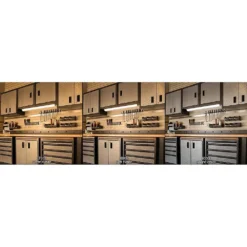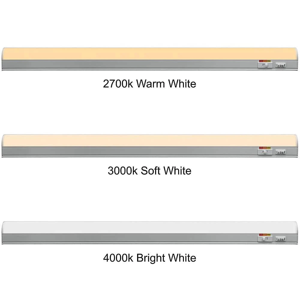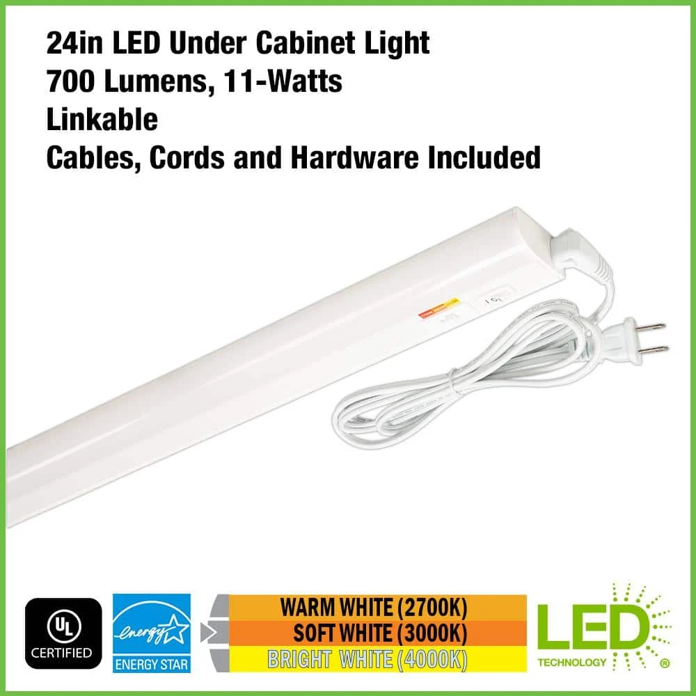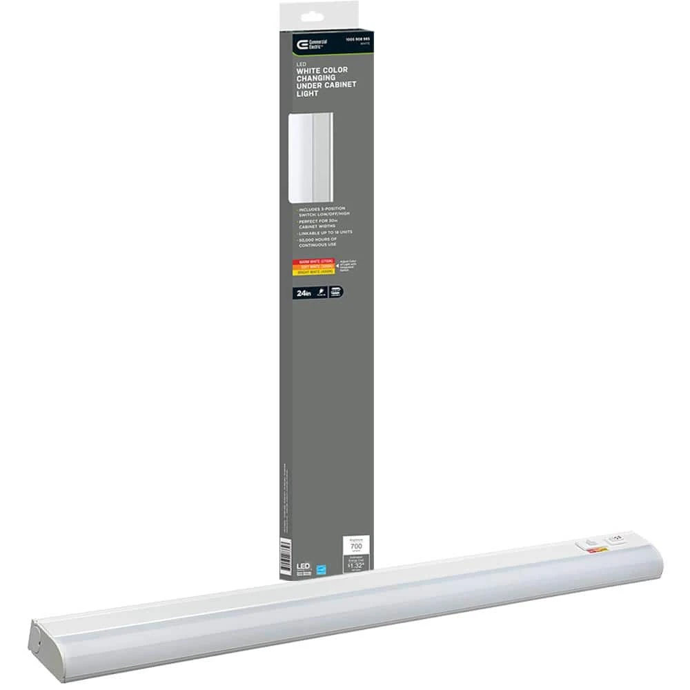Commercial Electric 24in. Plug-in Color Changing 3-Position Switch LED Under Cabinet Light is designed to replace over-heated under cabinet incandescent, puck and xenon lights with a crystal-clear energy-efficient LED fixture. What is unique about this fixture is that you customize the lights depending on your needs. Choose color of light output between Warm White, Soft White or Bright White and use the 3-position step-dimmer for Low or High illumination; change back and forth at any time. This fixture is perfect for 30in. cabinet widths and is linkable up to 18 units; cables, cords and hardware included. With a lifespan of up to 50,000 hours, our LED under cabinet light is maintenance free with absolutely no bulbs to replace. Perfect for kitchen preparation, underneath cabinets, under desk-hutch, workstations, cabinet unit, shelving, workbench, closet or accent lighting.