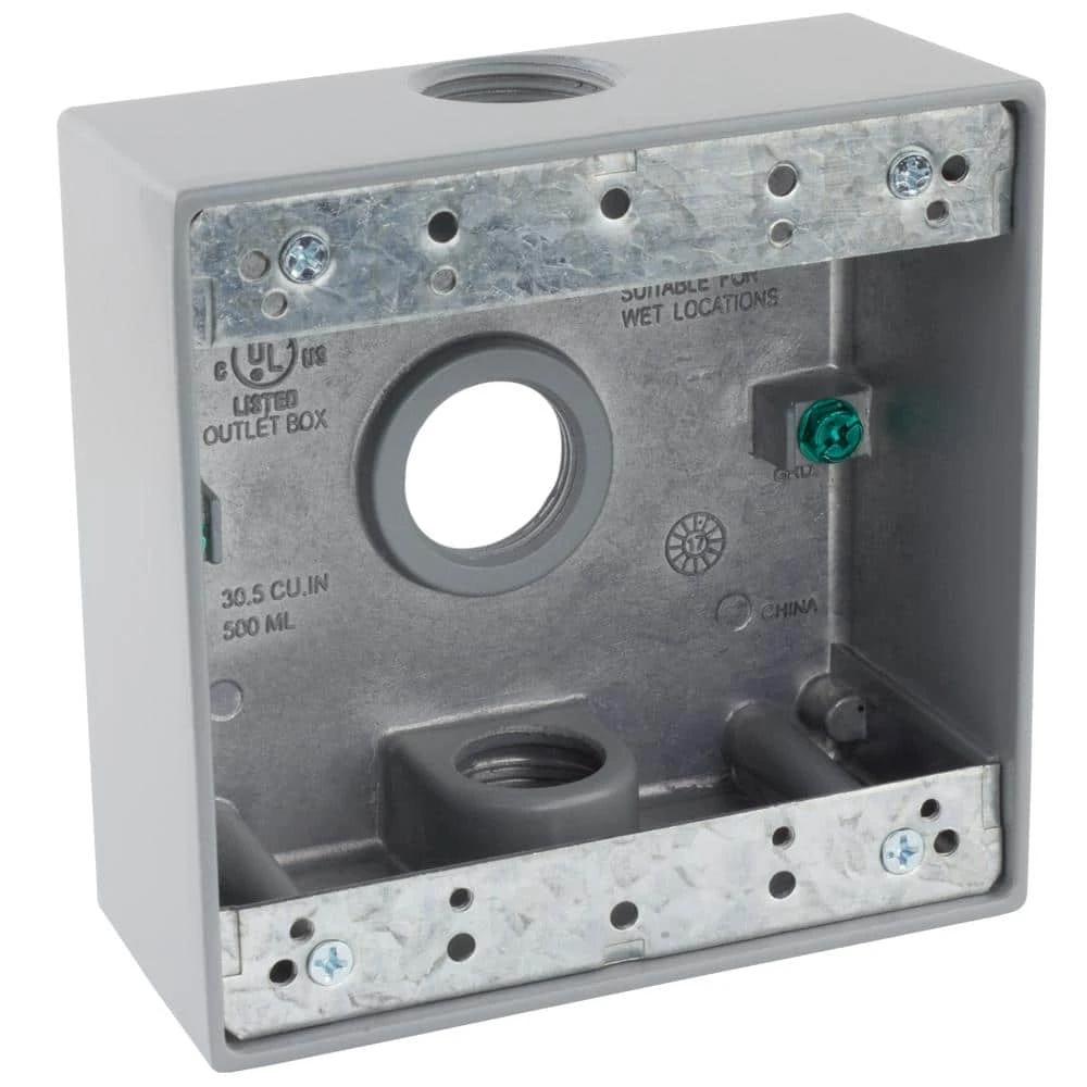Commercial Electric weatherproof boxes are designed for use in branch circuit wiring in wet, damp or dry locations. Boxes house receptacles, switches and GFCI’s. Boxes may also be used as a weatherproof junction box. Closure plugs and installation hardware included.