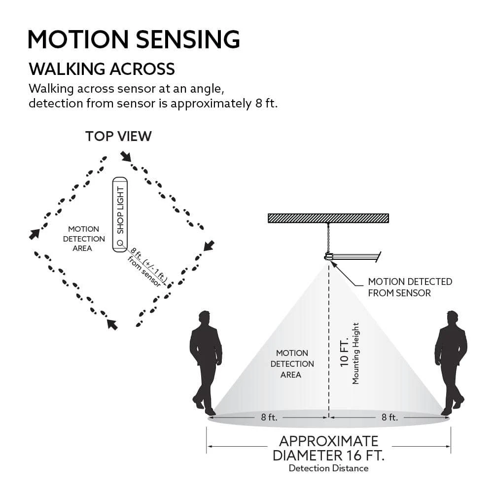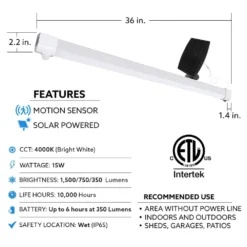The Commercial Electric 35 in. Solar Motion Utility LED Shop Light comes fully assembled and provides added brightness to any workshop, outdoor patio or garage. Solar-powered for easy wireless installation. Comes equipped with a 20 ft. cord between the solar panel and the light fixture, an ultra-light weight design is perfect for hanging or flush mount installations to suit your space. The LED utility light is wet or dry location rated so it has the versatility to be used indoors or outdoors. This Integrated LED light is equipped with a motion detector sensor that can operate at up to a 10 ft. mounting height. The fixture provides up to 6-hours of motion-activated 4000K Cool White light, after the motion is detected, the fixture will illuminate at 1500 Lumens for 2-minutes, then drop to 750 Lumens after 2-minutes if motion remains detected and then 350 Lumens after 4-minutes if motion continues to be detected. With no wiring needed, these lights install in minutes and the integrated LED means maintenance free operation for years, ideal for remote areas or places without power, such as sheds, garages or covered patios. It runs entirely on solar energy that is stored in rechargeable batteries with the light activated by motion. Choose this luminous general-purpose solar task lighting fixture for residential or commercial applications.