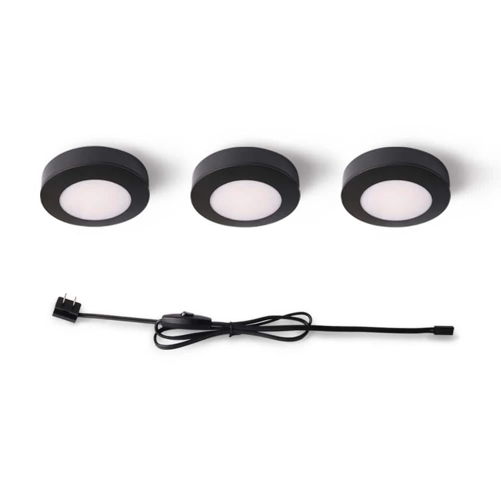 - Three 3.2-Watt LED puck lights with 2 ft. cable attached, 4 ft. adjustable power cord with on/off switch