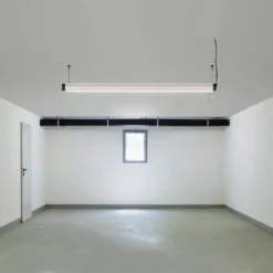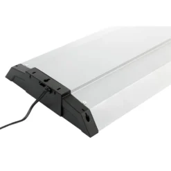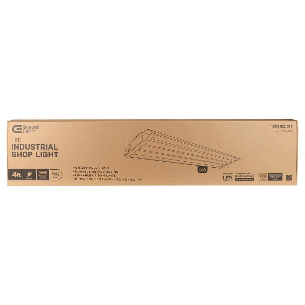 Commercial Electrics 4 ft.4-light Plug-in Integrated LED Heavy-Duty Utility non-dimmable shop light, uses 80-Watt and comes fully assembled with an ultra-light weight design that can be used in hanging or flush mount installation. This LED Shop Light lasts up to 50,000 hours and emits a bright light of 7000 Lumen which is equivalent to a standard four lamp fluorescent fixture. This no-humming LED Shop Light offers a cool white-light and adds instant full brightness to any dark lit area, even in sub-zero temperatures. There are no lamps to dispose of or replace with this 4 ft. four lamp LED shop light, making it ideal for garages, workshops or warehouses. includes two V-hooks, wall anchors and screw hooks with hanging chains, a convenient ON/OFF pull chain with 36 in extension chain with bell, a 5 ft. plug-in chord for power or link ability on one end and an outlet receptacle on the opposite end to allow up to 4 units to be linked together.