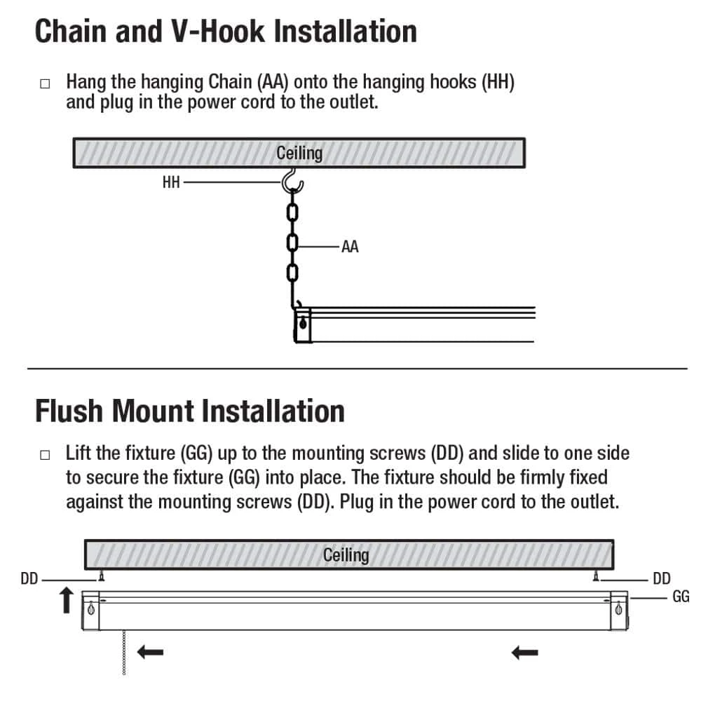 - Parts include (1) 4 ft. fixture, (3) mounting screws, (2) 12 in. hanging chains, 1 3 ft. pull chain and (1) 5 ft. plug-in cord