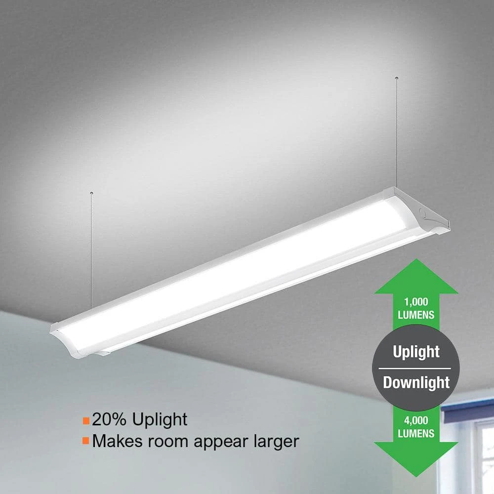 Commercial Electric’s 4 ft. Integrated LED Commercial Direct/Indirect Wraparound light is not only designed to provide light focused downward, but upwards as well. The main direct lighting output emits 4000 Lumens of brightness focusing downward using 38-Watts of electricity. The Indirect or up-light, illuminates upward and angled emitting 1000 Lumens using 12-Watt of electricity. While the up-light is activated, this produces the optical illusion that the room appears larger. The Indirect light offers 20% more light output and can be activated at the same time as the main direct light for a total of high output of 5000 Lumens. Perfect for spacious applications such as a conference room, classroom, lobby, reception area, waiting room, showroom, retail aisles, craft storeroom or small warehouse. Light engine delivers energy-efficient, long-life and crystal clear color to ensure high quality, low-maintenance lighting performance.