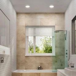 The Commercial Electric Ultra Slim Recessed Lighting Kits are designed specifically for small spaces where height clearance is limited such as beams or ductwork and you can change the color temperature with a flick of a button. The integrated color changing switch is located on the back of the light so you can choose between a 2700, 3000, 3500, 4000 or 5000 Kelvin temperature to best suit your needs. 2700 or 3000 Kelvin is perfect for relaxing, 3500 or 4000 Kelvin is the ideal choice for everyday affairs and 5000 Kelvin is great for task lighting in a basement, hallway or work area. ENERGY STAR certified and IC rated for direct contact with insulation, these lights won’t overheat, do not require a bulky can and will last for years to come – 50 000 hours or approximately 45 years if used for 4 hours per day to be exact. Wet rated and certified airtight, this 4 in. kit is perfect for your bathroom, drop ceilings, outdoor soffits and all general lighting applications.