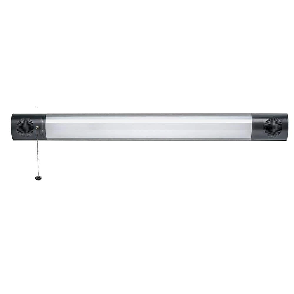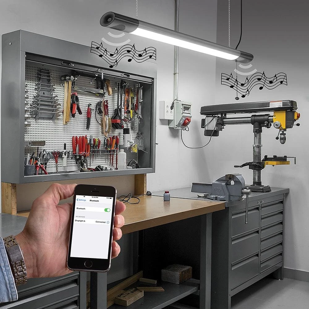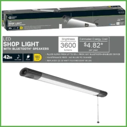 Commercial Electric 42in. Plug-in LED Shop Light with Bluetooth Speakers is designed to wirelessly connect to your smartphone to play your music or podcasts and still continues to provide crystal clear light output. You can activate audio from up to 33ft. and the speakers do not require any batteries or charging. Enable Bluetooth on your smart device using Commercial Electric’s app. To turn on just the light, there is a pull-chain for an easy grab. It is lightweight, easy to install and maintenance free with no bulbs to replace. Ideal for work shop, garage, basement, shed, small warehouse or entertainment room.