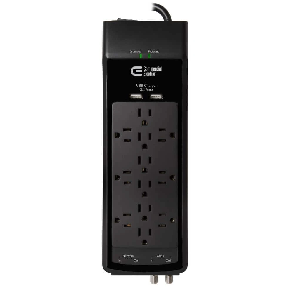 Enjoy reliable home entertainment or office surge protection with the CE 12-Outlet USB RJ45 Coax Surge Protector. This 12-outlet surge suppressor protects HDTVs, personal computers, cable/satellite receivers, phones/faxes/DSLs, cable modems, printers, stereos and CD/DVD players. The suppressor uses MOV technology to guard the suppressor and your connected devices against lightning surges and line abnormalities. EMI/RFI filters block unwanted line noise, too. Cable/Satellite TV receivers are protected with a RG-6 coaxial and phones, faxes, modems and DSL lines are protected via RJ-45 ports. The 6 ft. power cord includes a right angle plug with a 45 degree off-set for convenient installation in the tightest environments.