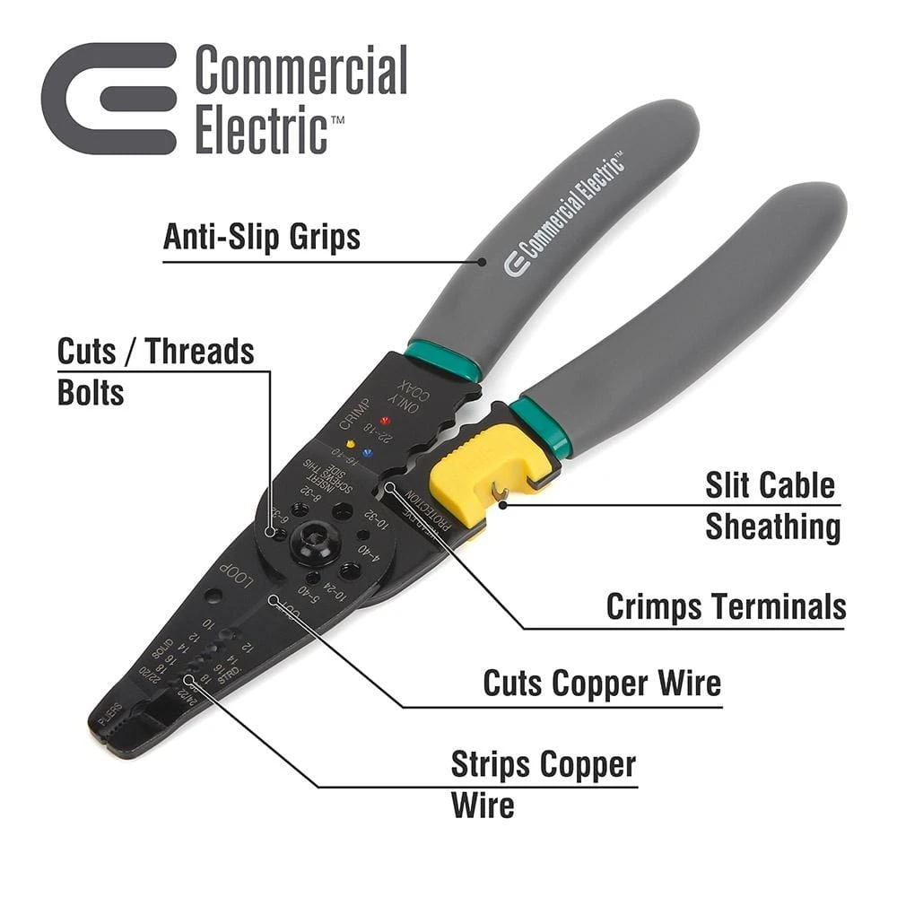 The Commercial Electric 8 in Wire Stripper with NM Ripper performs many of the functions needed to complete electrical wiring tasks. This wiring tool has the ability to strip wire, cut and thread bolts, and crimp terminals. Designed to be used on 10-22 AWG solid and 12-24 AWG stranded wire.