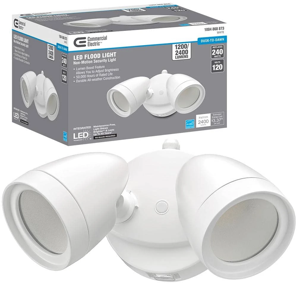Commercial Electric Dusk to Dawn Lumen Boost White Twin Head LED Security Flood Light is the perfect solution for your outdoor lighting needs. Choose Dusk to Dawn feature for lights to automatically turn on at sunset and turn off at sunrise. Activate Lumen Boost feature which offers the choice of lighting intensity from main light at 1200 Lumens to high intensity at 2400 Lumens. Adjust the twin light heads to desired beam angle using your hands. This is made of durable all-weather construction; perfect for sub-zero weather all the way down to -40°! No more worries about climbing a ladder or hiring an electrician to change light bulbs, this is maintenance free with no bulbs to replace. Our LED security flood light ensures an abundance of safety and awareness, prevents possible injuries and increases property value.