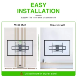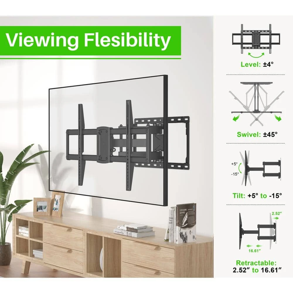 Get the best seat in the house and achieve the perfect viewing angle with the Full Motion TV Wall Mount from Commercial Electric. Mount your television securely to the wall and allow for multiple viewing angles with 90° swiveling capacity and 15 tilt options. Made for televisions from 32 in. to 90 in., this versatile mount can handle up to 132 lbs. Pulls out to 16.61 in. and smoothly returns back in to 2.52 in. Installing and adjusting your wall mounted television has never been easier. Offers a quick and easy installation on wood stud and concrete wall.