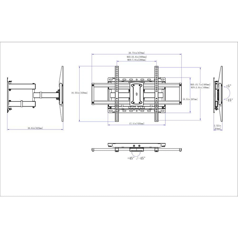 - Pulling out to 16.61 in. and back in to 2.52 in. from the wall gives your TV smooth moves, effortless 90° swiveling capability gives you the best view from any seat in the house