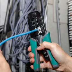 - Cuts, strips and crimps RJ-45, RJ-11 and RJ-12 modular plugs