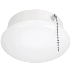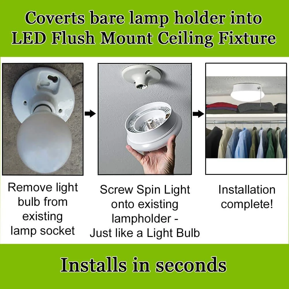 Commercial Electric’s 7 in. Pull Chain Spin Light Integrated LED Flush Mount Ceiling Light converts incandescent lights to energy-efficient LED fixture. This Spin Light is designed to simply screw into most existing plastic and porcelain lamp holders without any wiring required. Converts your lamp holder to a fixture in no time at all. *Direct wire option is available using bracket included in box. For quick activation, use the pull chain for an easy grab; add a decorative finial at the end to grasp as well. This fixture emits 830 Lumens of brightness using only 11-Watt of energy saving electricity, the environment and your wallet. Great for closets, bathrooms, stairways, basement, garage, attic or laundry room.
