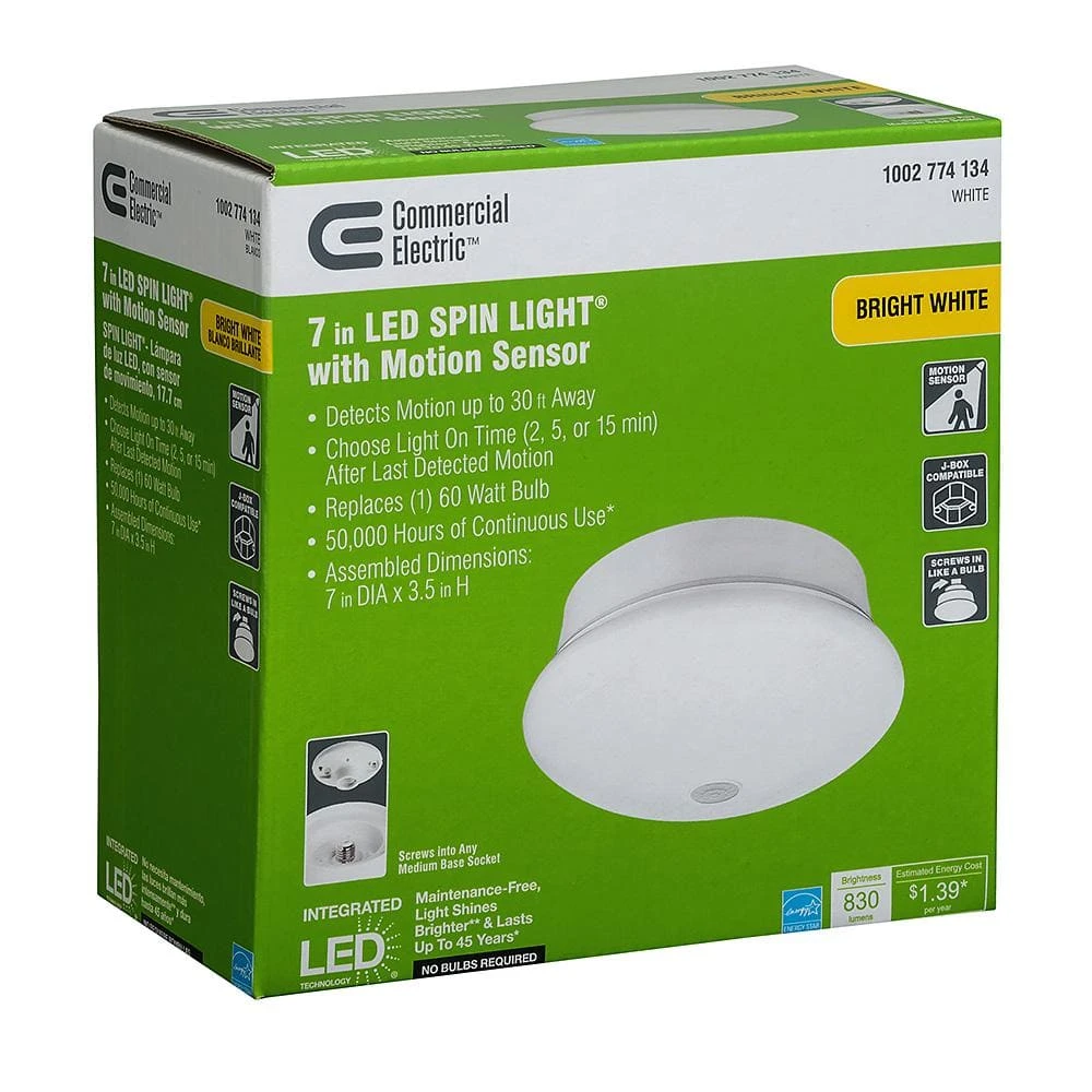 Commercial Electric’s Spin Light 7 in. Motion Sensor LED Flush Mount ceiling light have two unique functions; converts bare lamp holder into an energy-efficient LED fixture and built-in motion sensor. Spin Light fixtures are designed to screw into most existing plastic and porcelain lamp holders without any wiring required. You control the motion sensor by adjusting hold times: 2, 5 or 15 min. after last detection. It eliminates the hassle of feeling around for the wall switch or pull cord when entering a space. Light detects motion up to 8.5 feet. This motion sensor fixture emits 830 Lumens of brightness using 11.5-Watts of energy and 4000K Bright White color temperature of light output. It is easy to install, has long-lasting light engine and maintenance free with no bulbs to replace. Ideal for closets, garage, pantry, laundry room, stairway, hallway or other dark areas.