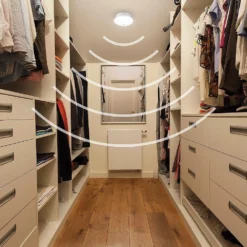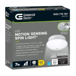 Commercial Electric Spin Light 7in. Motion Sensor LED Flush Mount ceiling light have two unique functions; converts bare lamp holder into an energy-efficient LED fixture and built-in motion sensor. Spin Light fixtures are designed to screw into most existing plastic and porcelain lamp holders without any wiring required. You control the motion sensor by adjusting hold times: 2, 5 or 15 min. after last detection. It eliminates the hassle of feeling around for the wall switch or pull cord when entering a space. Light detects motion up to 8.5 feet. This motion sensor fixture emits 830 Lumens of brightness using 11.5-Watts of energy and 4000K Bright White color temperature of light output. It is easy to install, has long-lasting light engine and maintenance free with no bulbs to replace. Ideal for closets, garage, pantry, laundry room, stairway, hallway or other dark areas.