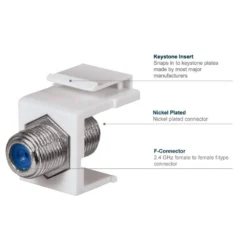 Commercial Electric nickel-plated female-to-female connectors have screw-on front and rear connections for easy termination. They can be used with a number of A/V components, from standard TV to satellite TV. They are compatible with F-connector coaxial cable.