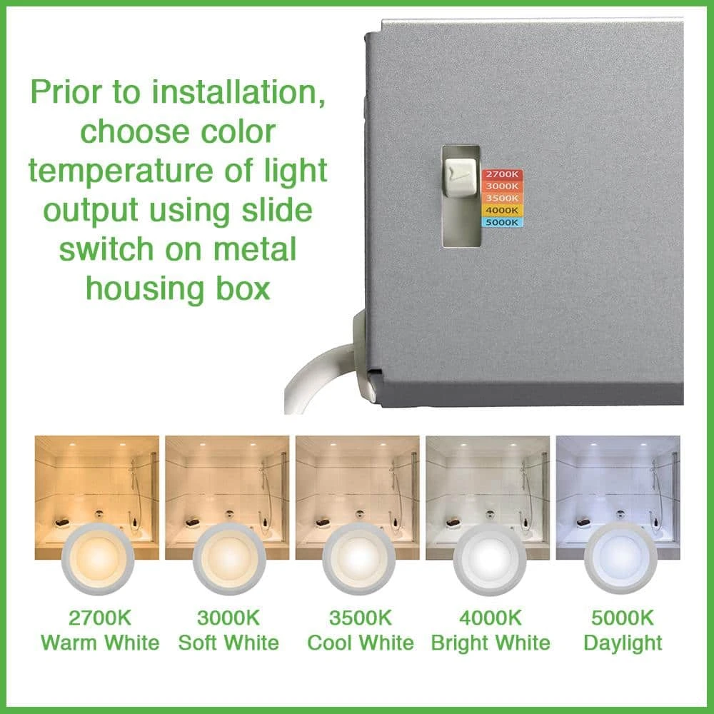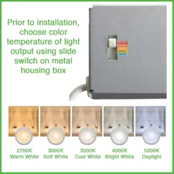 - Color temperature options: 2700K warm white, 3000K soft white, 3500K cool white, 4000K bright white and 5000K daylight
