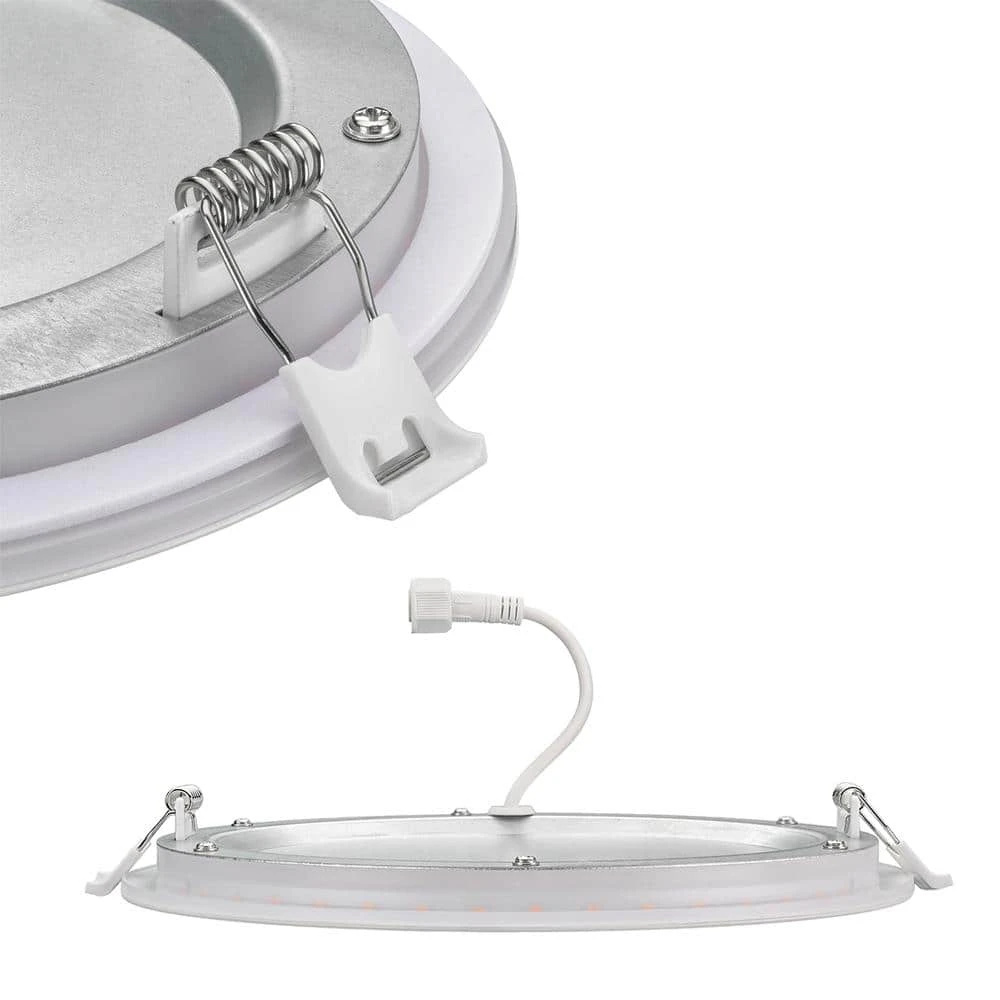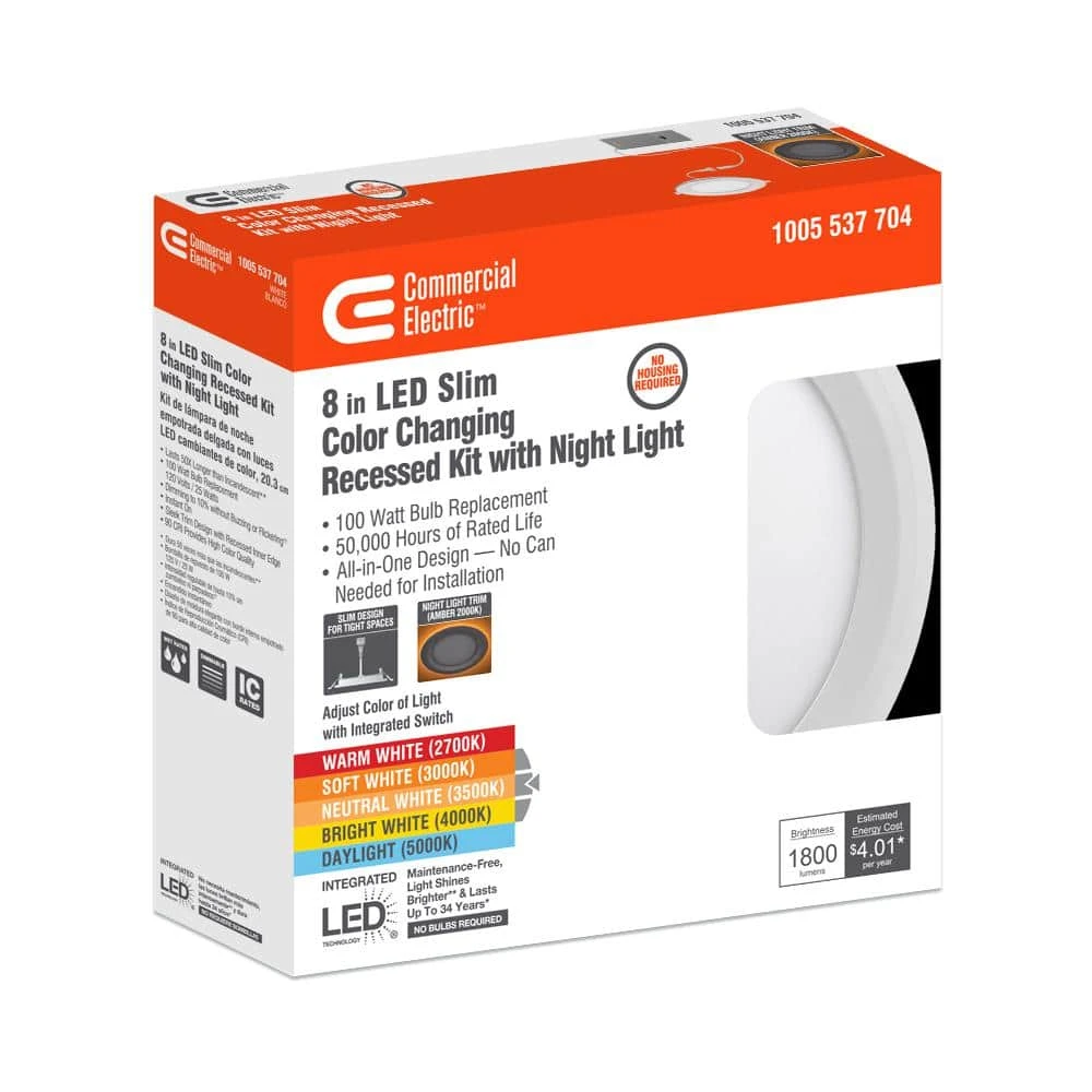 Commercial Electric 8in. Canless Ultra Slim Integrated LED Recessed Downlight with Night Light feature and multiple light output options is one of the most innovative and simplest ways to upgrade your existing recessed lights to energy-efficient LEDs. This innovative fixture offers three unique features than any other light on the market! First, the canless, ultra slim design is the wave of the future; no need for cans or joist; easily installs into low clearance or sloped ceilings. Second, you choose between (5) color temperatures of light output for your space; Warm White, Soft White, Cool White, Bright White or Daylight and you can change your mind anytime. And third, the Night Light trim feature glows a soft Amber hue around the light when you activate it from your wall switch. This fixture emits 1800 Lumens of brightness using only 25-Watt of energy conserving electricity, the environment and your wallet. It is easy to install, long-lasting and maintenance free with no bulbs to replace. Ideal for living room, entry way, hallway, kitchen, basement, office, retail shops, theaters, lobby and much more.
