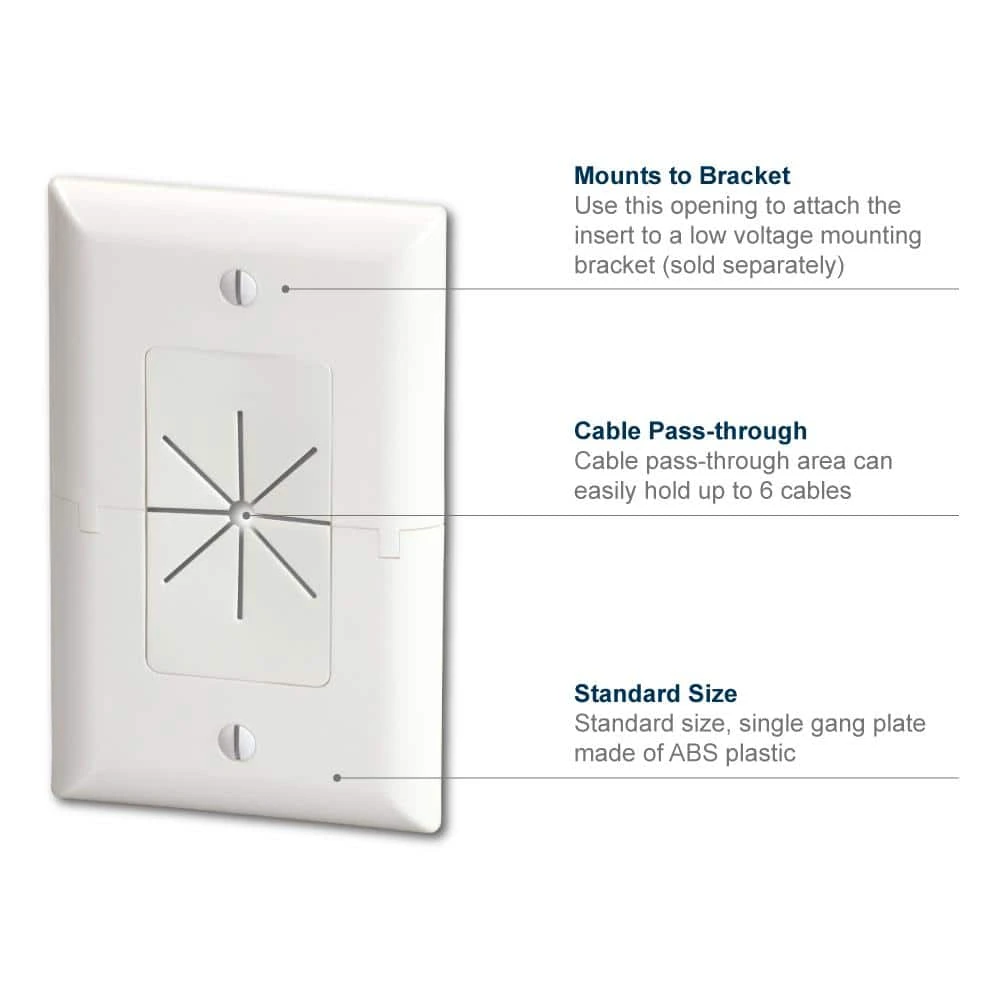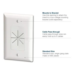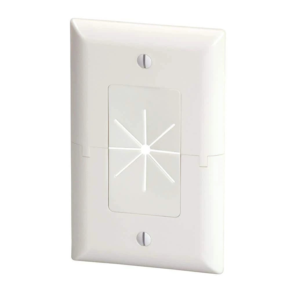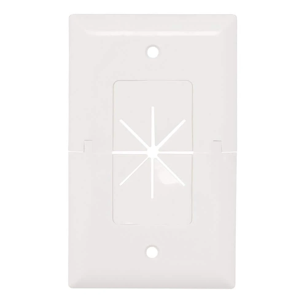 Commercial Electric’s patented 1-Gang Split Wall Plate is used to install low voltage cables behind your HDTV, amplifier or other audio/video devices. With the split design, this cable plate can be installed around existing low voltage cables run through the wall, eliminating the need to re-pull wires keeping the opening in the wall covered. Its horizontally split design allows for easy installation and removal.
